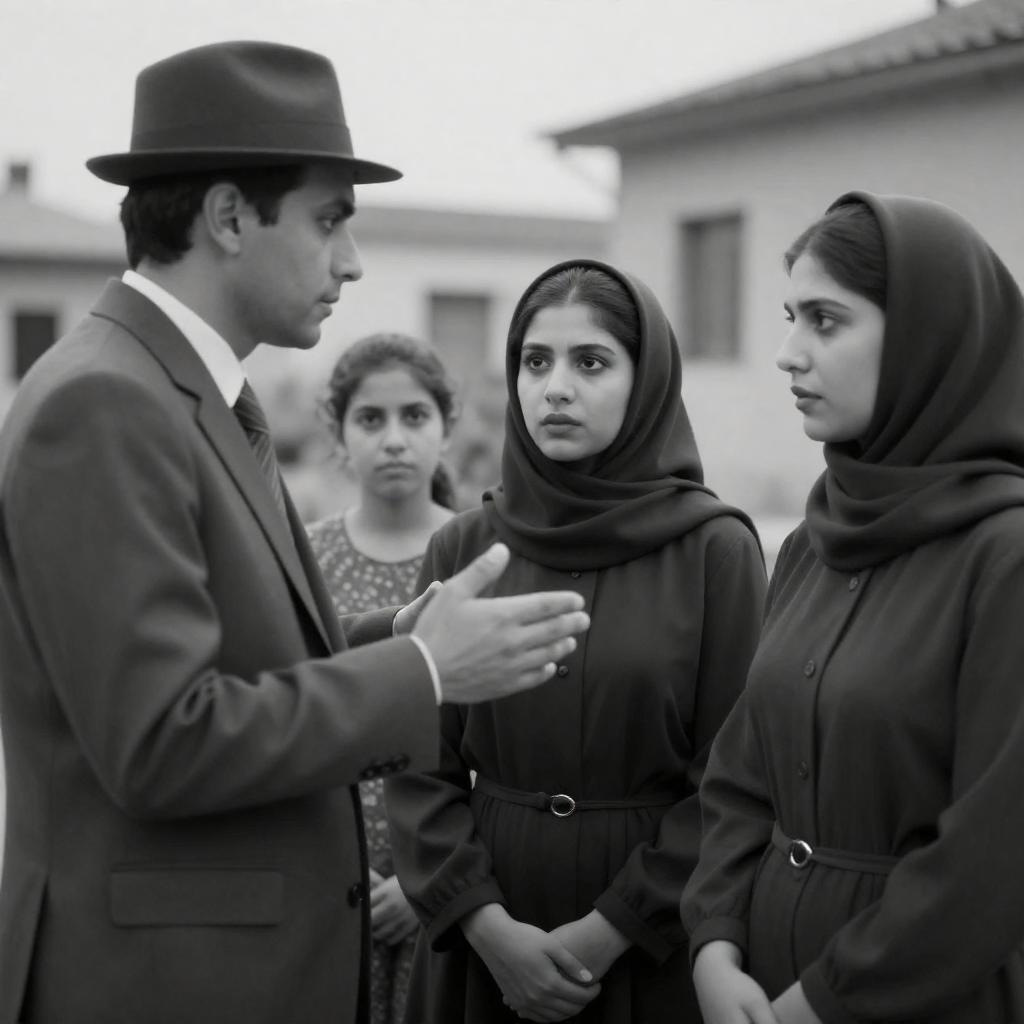 Black-and-white photograph of four women in traditional clothing. Three women wear head coverings, one with a dark veil, one with a patterned headscarf, and one with a plain headscarf. Central woman looks serious, others show neutral expressions. Rocky background. Women stand close together, looking forward. Two women on the right hold objects.