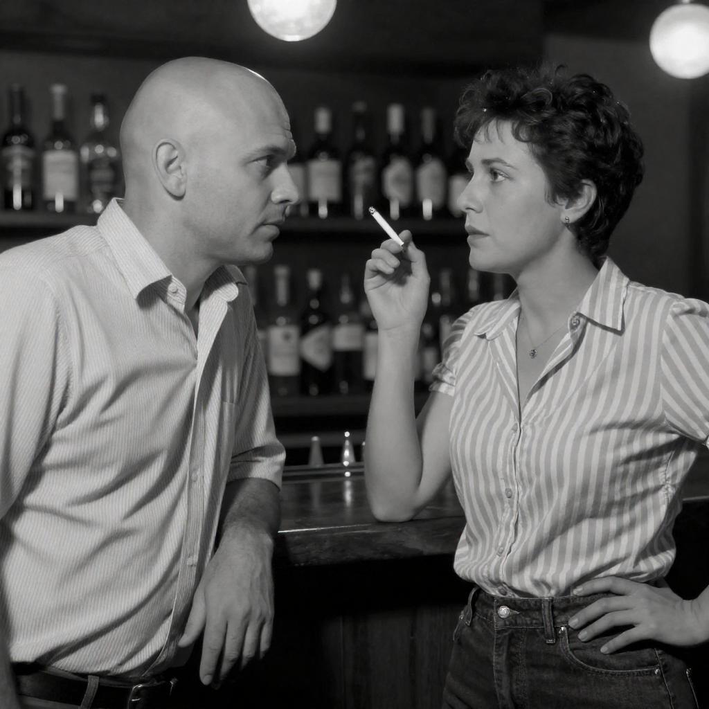 Black-and-white photograph of a bar scene. A bald man in a striped shirt leans forward on a table, while a woman with short hair and a striped shirt stands to his right, holding a cigarette. Background includes blurred bar shelves with bottles. The woman's posture is relaxed, and the man's expression is focused.