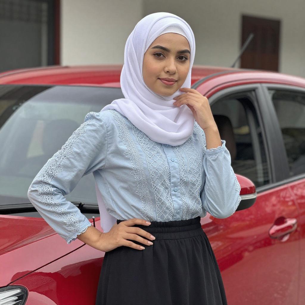 Photograph of a young woman with light brown skin and dark brown eyes, wearing a white hijab and beige long-sleeve top with buttons, and a beige skirt. She stands confidently with hands on her hips, smiling slightly. Behind her is a black car and modern building with glass doors.