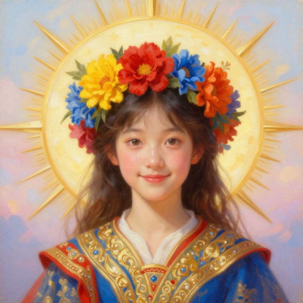 A highly detailed oil painting of a young girl with a gentle smile, wearing a vibrant floral crown featuring red, yellow, and blue flowers. She is dressed in an ornate garment with blue, gold, and red accents. Behind her head is a radiant, circular halo with golden rays extending outward, set against a soft, pastel-colored sky background.
