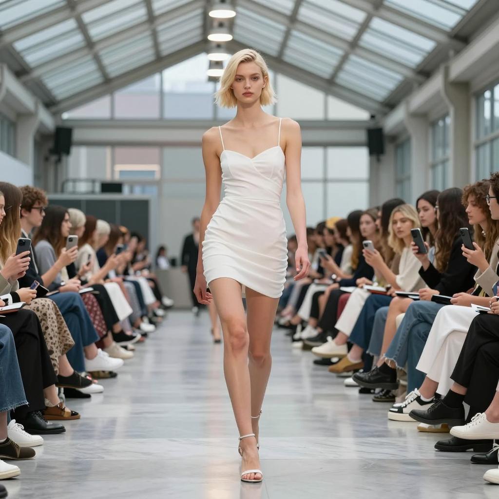 A slender blonde model with fair skin walks confidently down a glossy marble runway wearing a white ruched mini dress with thin straps. The fashion show takes place in a spacious industrial venue with a large glass roof and overhead lights. The runway is lined with a seated audience on both sides, many holding smartphones to capture the event. The background features industrial elements and large windows allowing natural light to enhance the modern atmosphere.