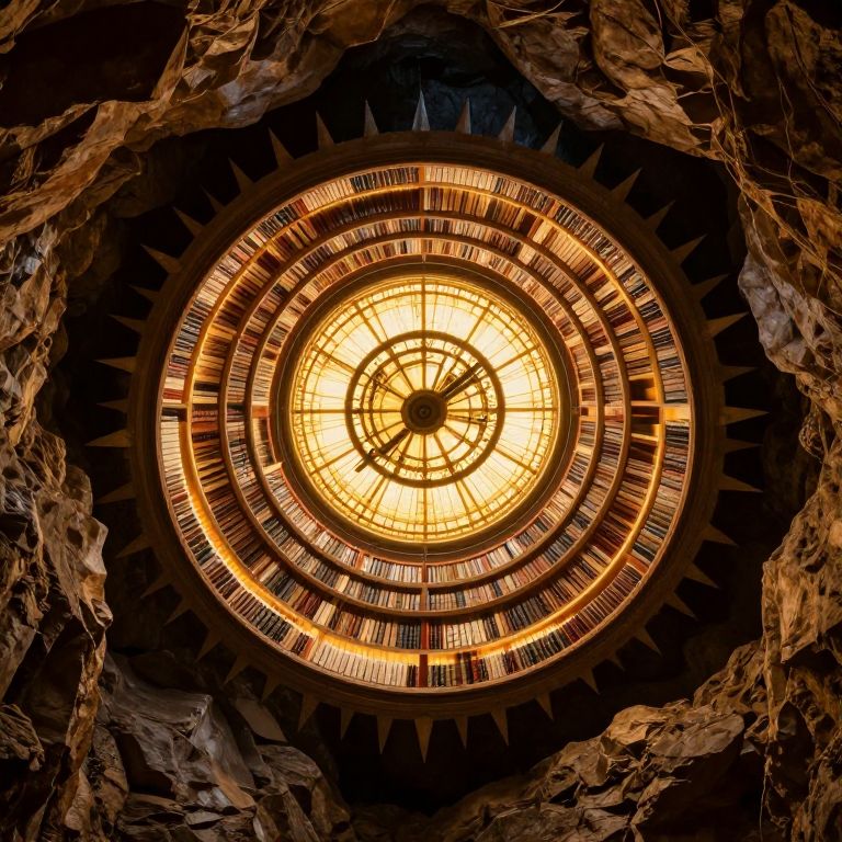 Circular structure suspended between rocky cliffs, featuring concentric rings of illuminated shelves filled with books, crowned by a spiked outer rim and a radiant, glowing core resembling a mechanical clock face, all bathed in warm, ambient light.