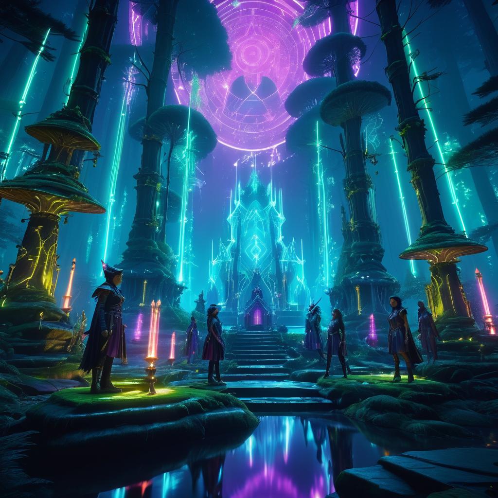 Scene of a group of elves in a twilight forest with cyberpunk elements, mystical shrines, and luminous neon light effects. Cinematic lighting, detailed and realistic, science-fiction fantasy blend, 8k resolution, atmospheric and immersive environment.