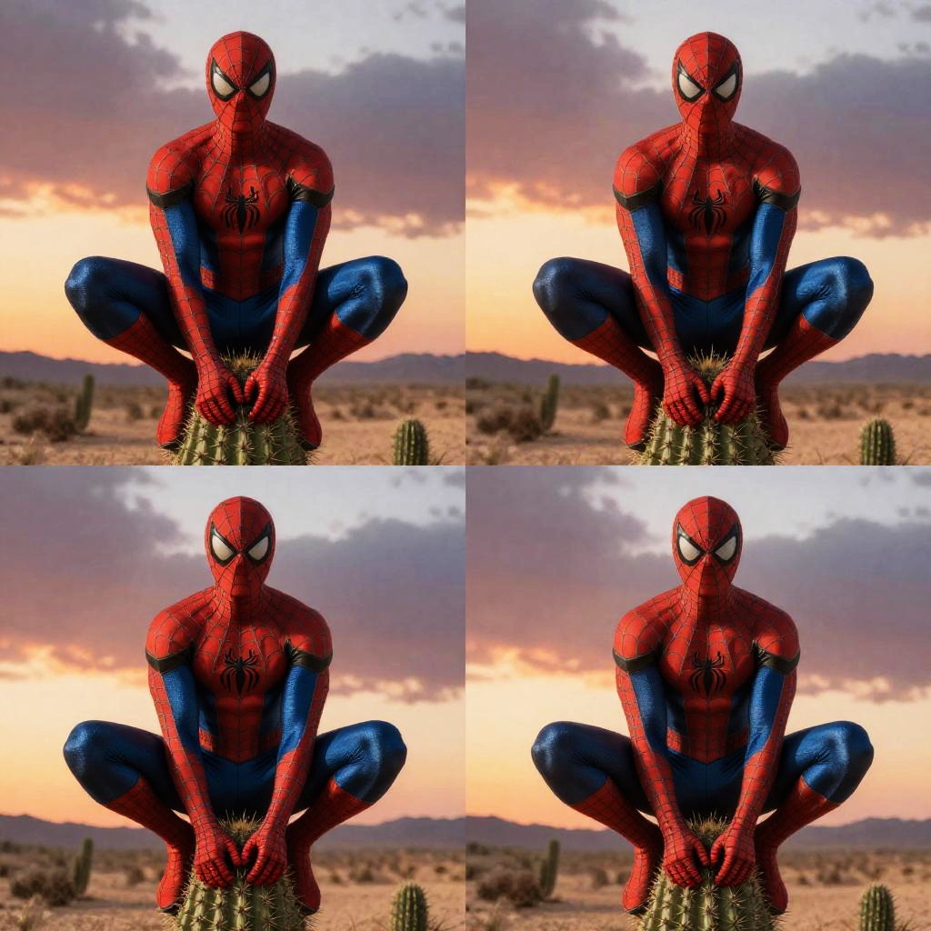 Photograph-style CGI of Spider-Man in red and blue suit, crouched on cactus, in desert at sunset; four identical images arranged in