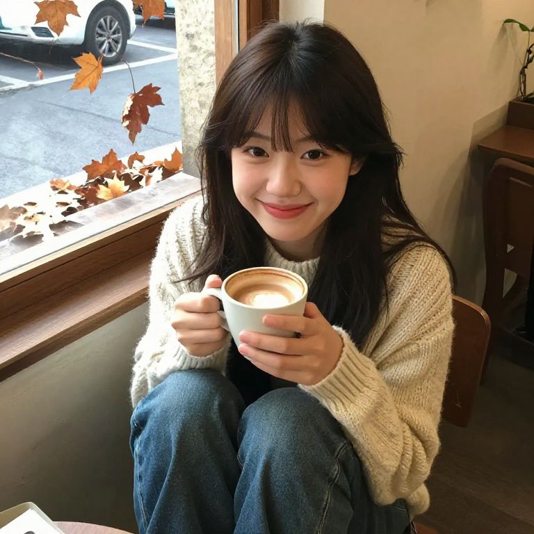 Cute 19 year old girl with a playful smile, wearing a knitted sweater and jeans, holding a cup of hot cocoa in a rustic café, warm lighting, autumn leaves outside the window, detailed textures, cozy and inviting vibe