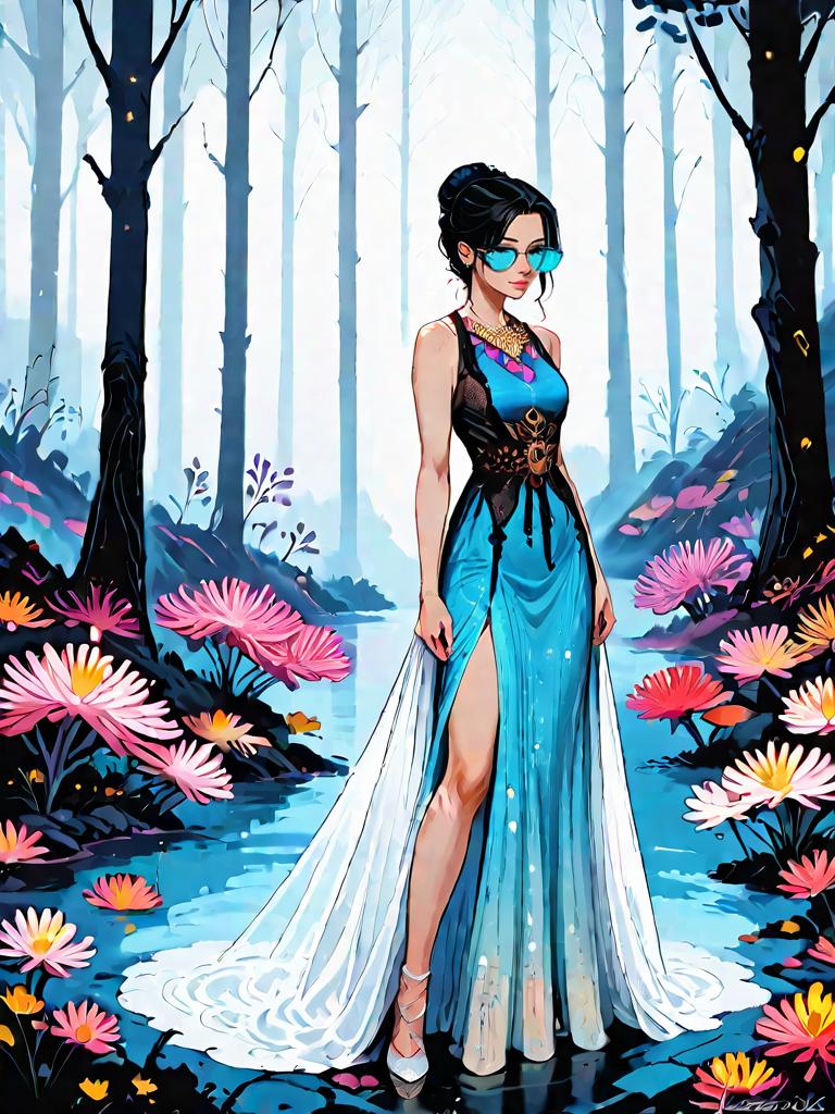 Full body, 1girl, dark_fantasy, medieval dark_forest, fog, torchlight, night mist ominous, comic Lace-Up Designs Bodycon Dress, midi length, soft cotton jersey, vibrant coral, crisscross lace-up back, sleeveless design, high slit, styled with nude strappy heels, layered gold necklaces, oversized sunglasses.