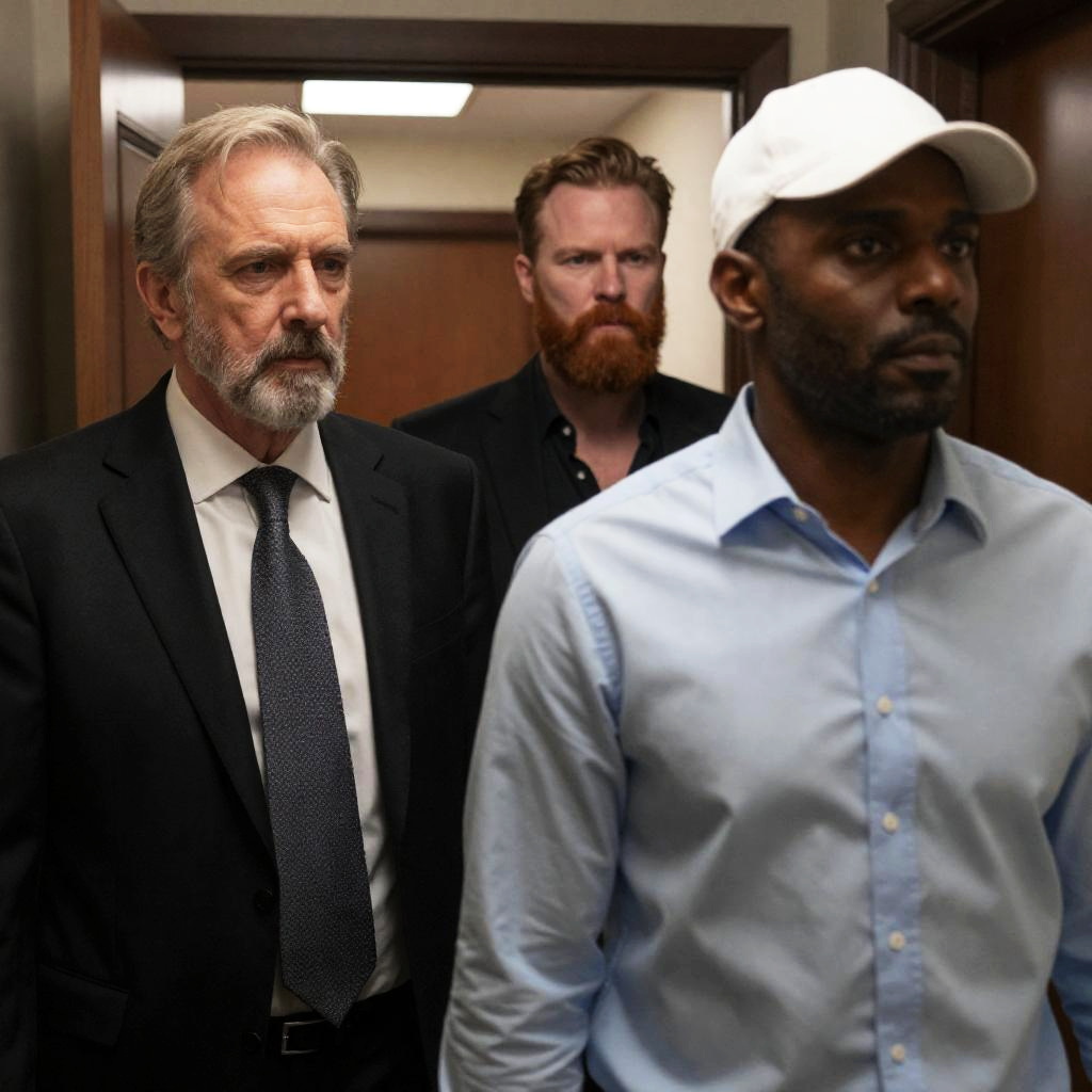 Three men in a hallway. Foreground: African-American man in light blue shirt and white cap, looking right. Left: older white man with gray beard, black suit, patterned tie, looking at African-American man. Background: white man with red beard, black suit, open shirt, looking forward. Doors and hallway in background. Intense expressions.