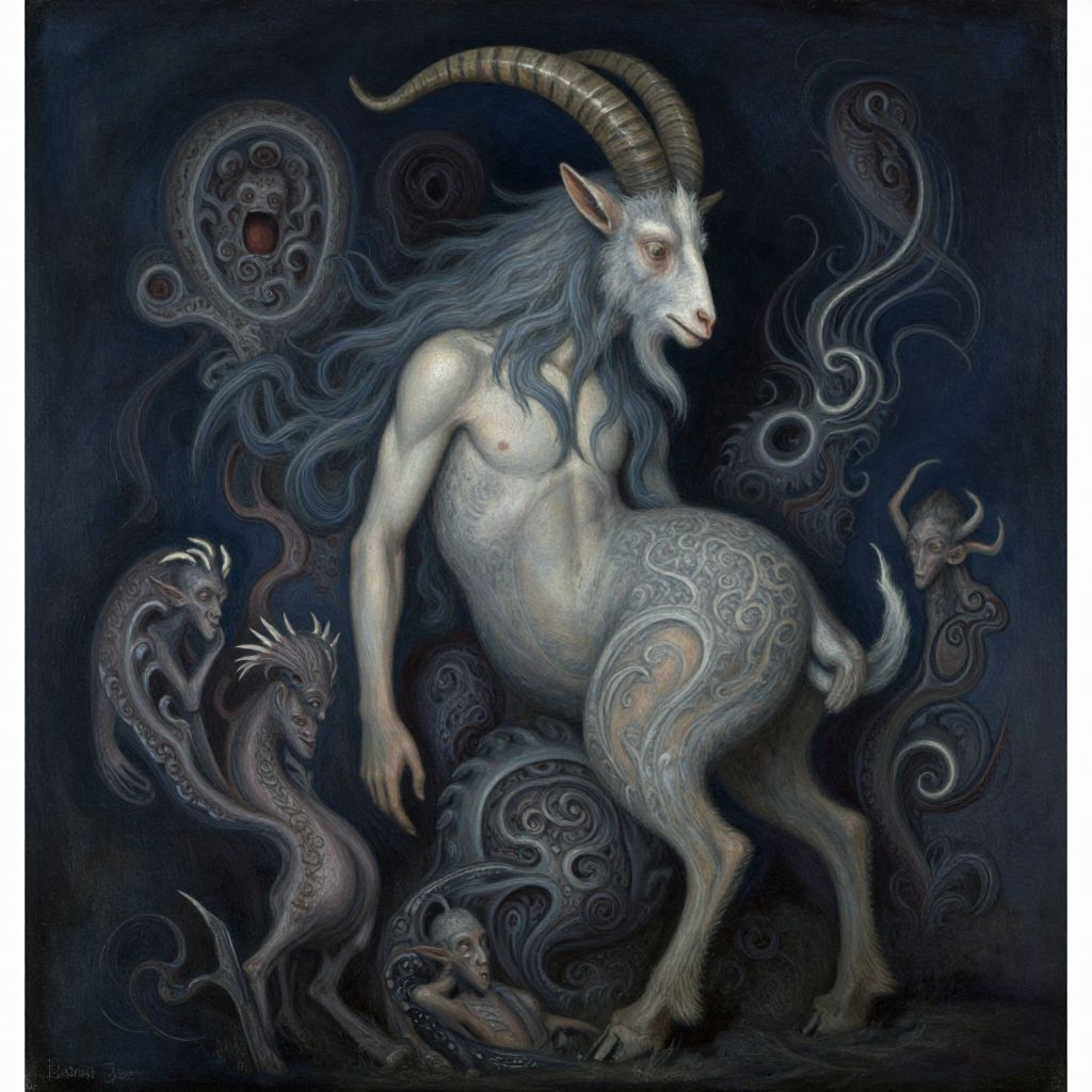 The image depicts a dark, haunting scene with a central figure that appears to be a satyr, a mythical creature with the body of a man and the head of a goat. The figure is rendered in a detailed, almost surreal style, with intricate textures and a muted color palette dominated by shades of blue and gray. The satyr's long, flowing hair and horns add to the sense of otherworldliness. Surrounding the satyr are various fantastical elements, including twisted, organic shapes and what appear to be small, demonic figures. The overall composition is dense and layered, with elements overlapping and intertwining, creating a sense of depth and complexity. The scene evokes a sense of folklore horror, with its dark, eerie atmosphere and the presence of mythical creatures. The artist's signature, James Jean, and the mention of Joao Ruas suggest a collaboration between two artists, adding to the intrigue and mystique of the image.