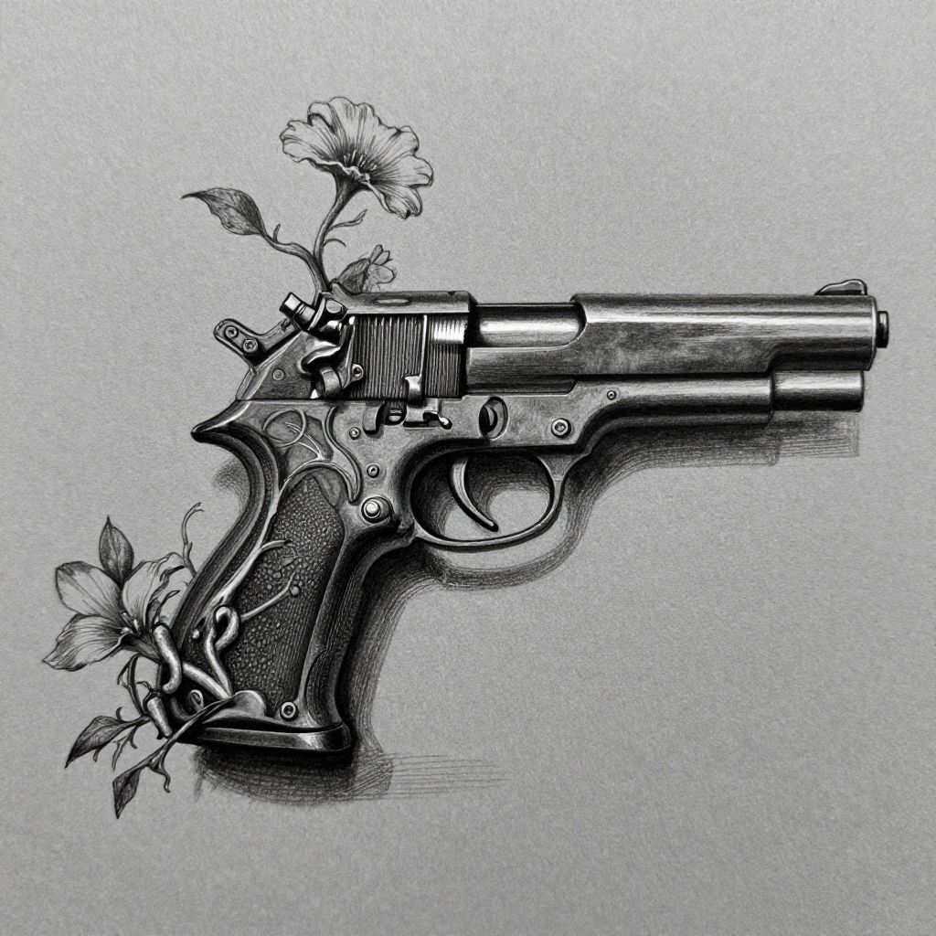 Fake gun drawing, surreal charcoal sketch of a gun morphing into flowers and vines, dark dramatic shadows, highly detailed organic forms blending with mechanical parts, on textured grey paper