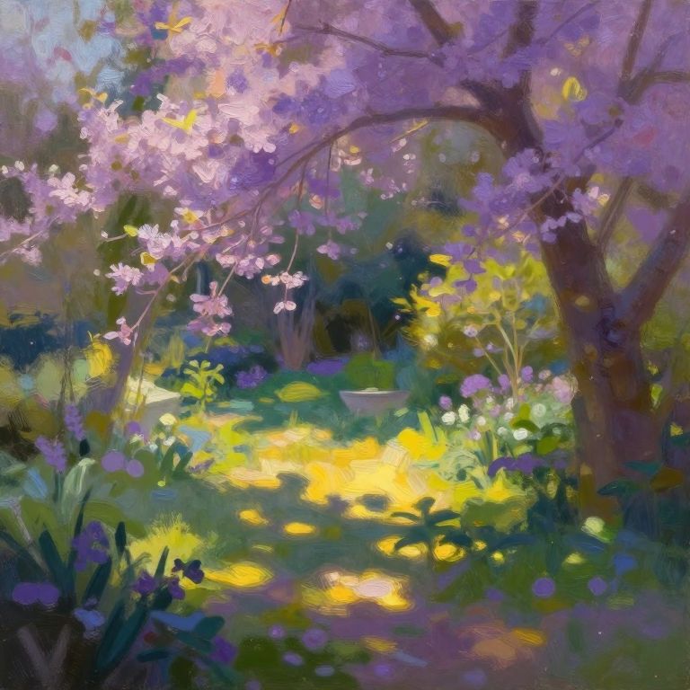 Vibrant digital painting of a sunlit garden with purple blossoming trees, yellow dappled light, and lush greenery, capturing a serene