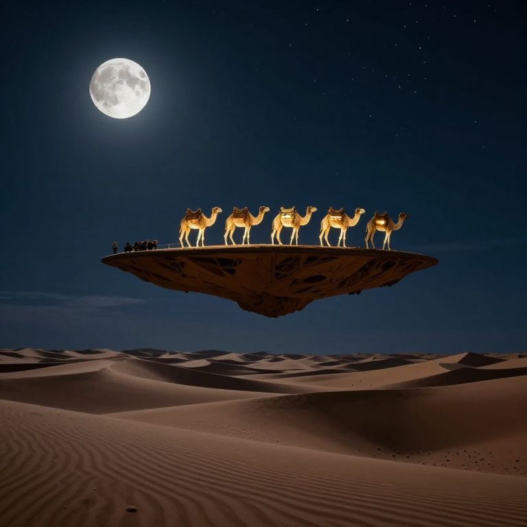 A floating desert island drifts slowly through the night sky, its dunes shimmering with stars as luminous camels ascend to the moon like elevators in a cosmic caravan.