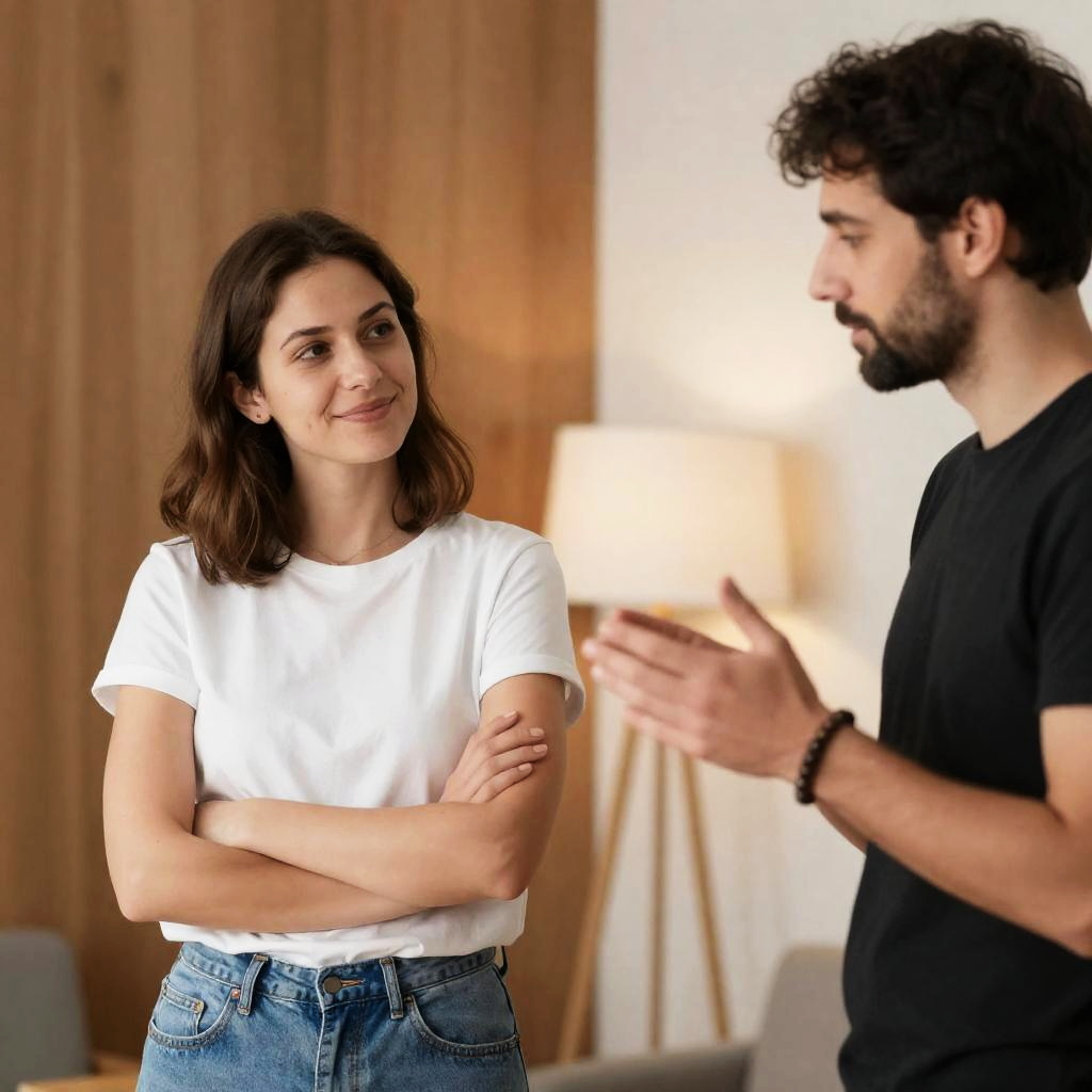 Photograph of a man with dark hair and beard facing a woman with curly brown hair, wearing a gray shawl. Man in white lab coat with blue stripes, woman with intense expression. Minimalist white room, fluorescent light. Man's back to camera.