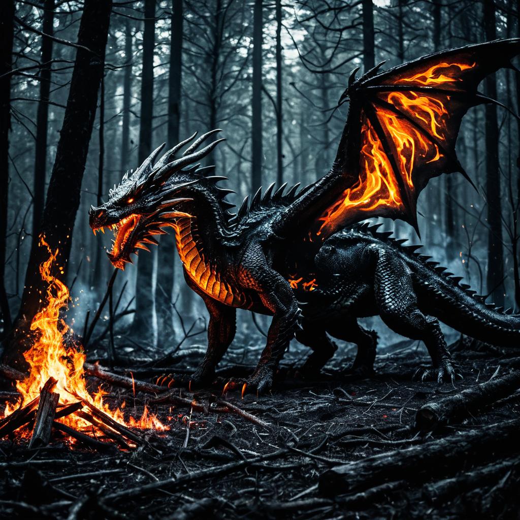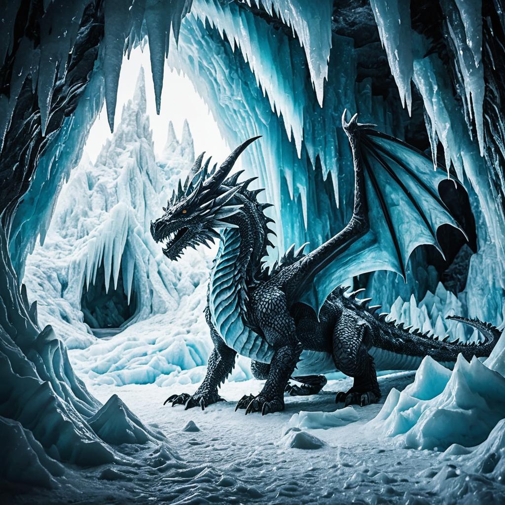 Digital painting of a black ice dragon with sharp spikes and wings standing inside an icy cave filled with detailed ice stalagmites and stalactites, showcasing intricate frozen textures and a magical glacial atmosphere.