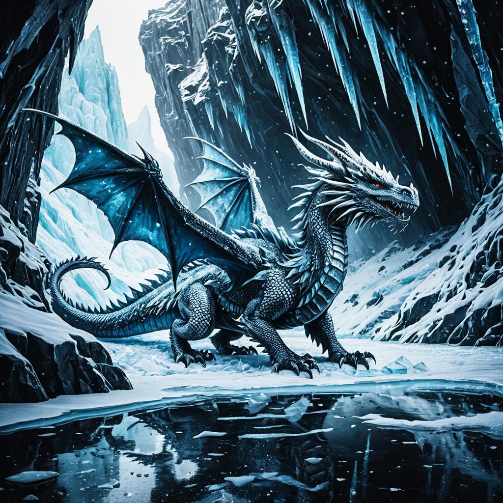 Ice painting of ice stalagmite dragon in a icing cave interior, featuring intricate ice textures and glacial details in a magical atmosphere.