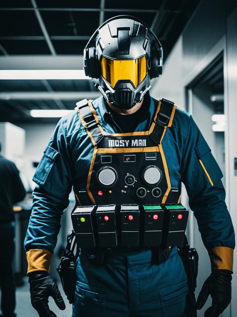 Close-up portrait of a man wearing a detailed cosplay costume inspired by the Operation board game. The costume features a yellow mask with large round eye pieces and a gas mask filter, a white helmet with a camera-like device, and a black tactical vest labeled 'NOSY MAN'. The overall look is futuristic and mechanical, captured in a low light setting with dramatic lighting.