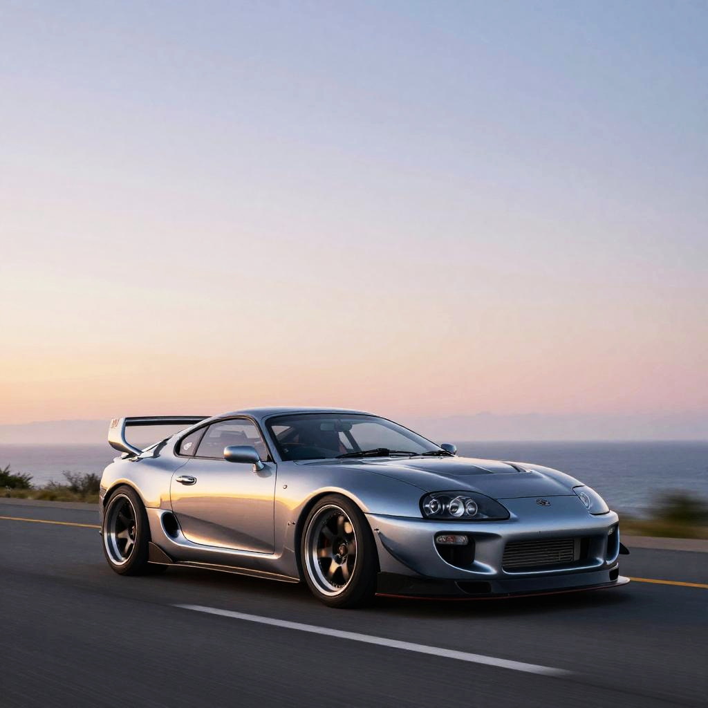 Wide body Supra MK4 racing through a neon-lit urban street at night, sleek aggressive stance, glowing undercity lights, detailed carbon fiber accents, dynamic motion blur, cyberpunk aesthetic, high contrast shadows and vibrant reflections, hyper realistic style.
