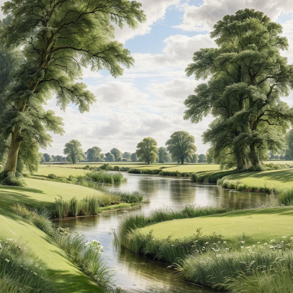 Detailed illustration of a serene riverside meadow landscape featuring lush green grass, gently flowing river, and tall leafy trees under a partly cloudy blue sky, inspired by John Constable's style.