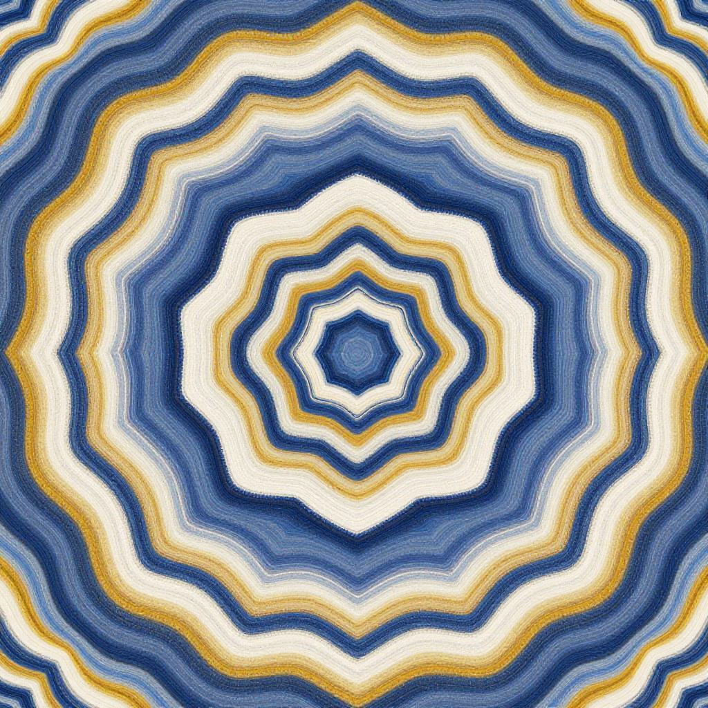 This image is a digitally-created, abstract pattern featuring a dense, intricate design of overlapping, concentric wave-like shapes. The color palette includes rich blues, creamy whites, and golden yellows, creating a vibrant, textured appearance. The pattern has a sense of depth and movement, with the waves appearing to swirl and merge across the entire composition. The style is reminiscent of modern digital art with a focus on geometric repetition and vivid contrast.