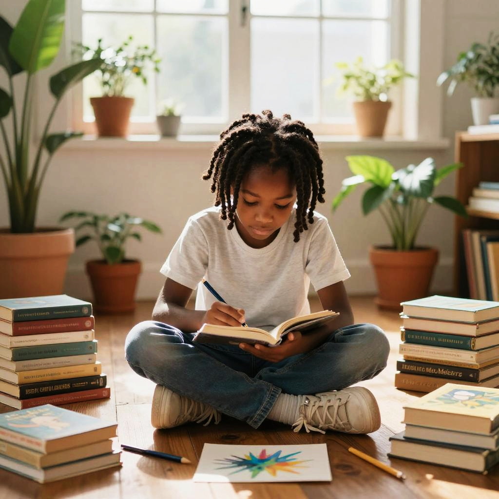 Photograph of a young girl with light brown hair, sitting on a beige cushioned chair by a sunlit window. She is wearing a white t-shirt and light blue jeans, and is intently reading a colorful children's book with a yellow cover featuring a red and green cartoon character. Sunlight streams through the window, casting a soft glow on her face and creating shadows on her freckled cheeks. The window has raindrops on it, and outside, a blurred, green outdoor scene is visible. The girl's expression is focused and peaceful.