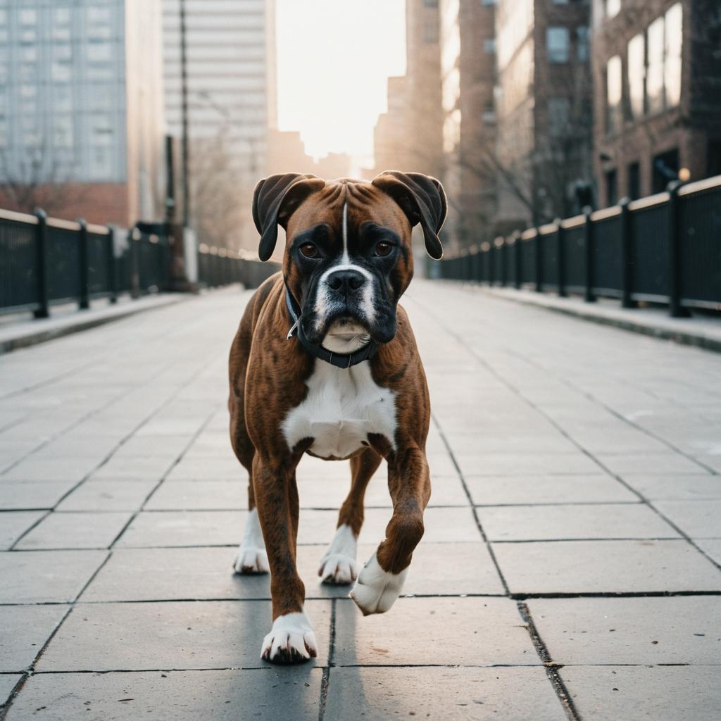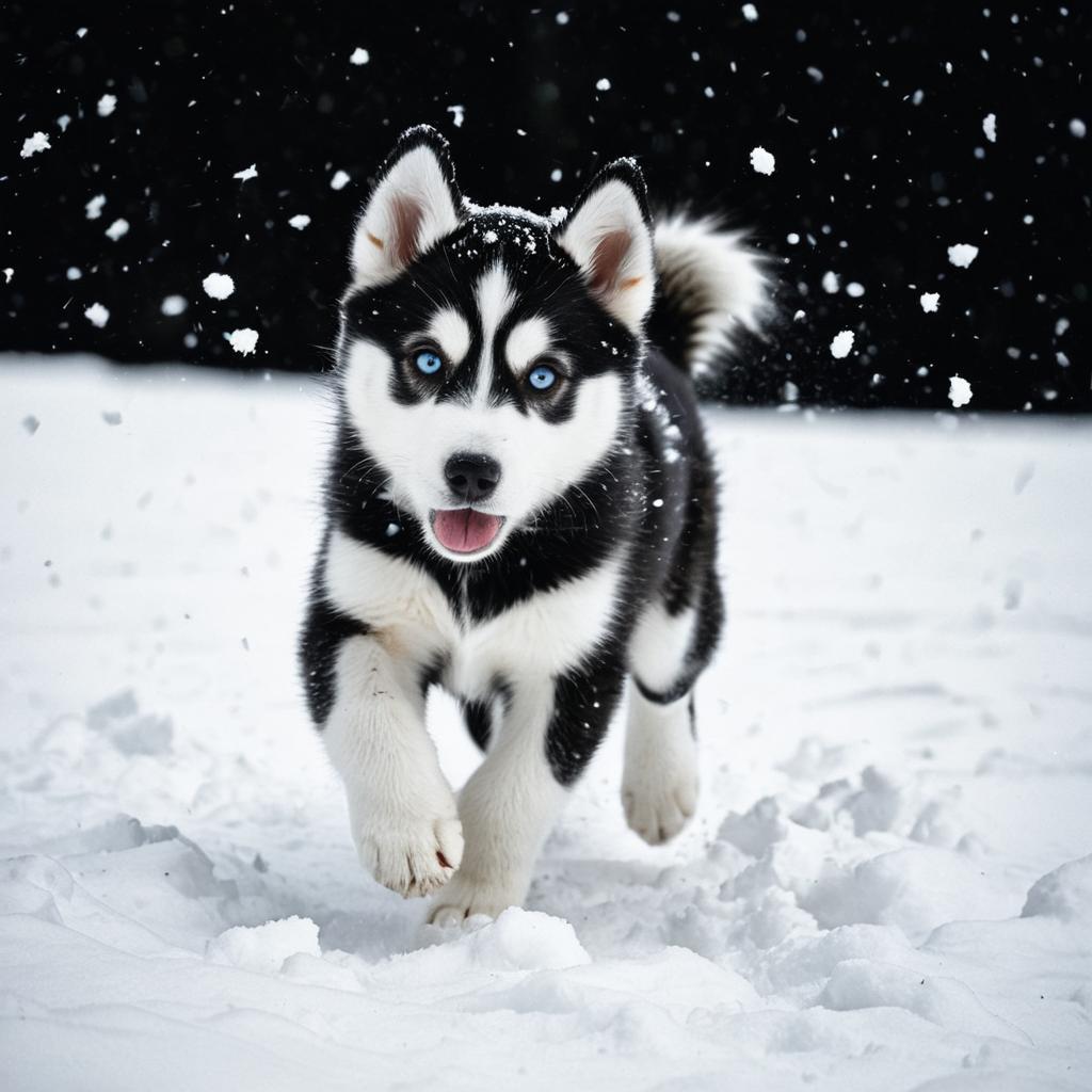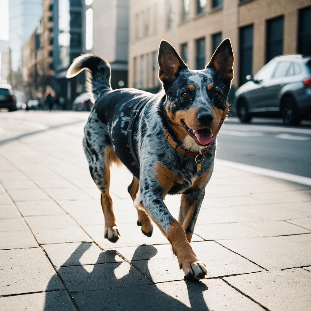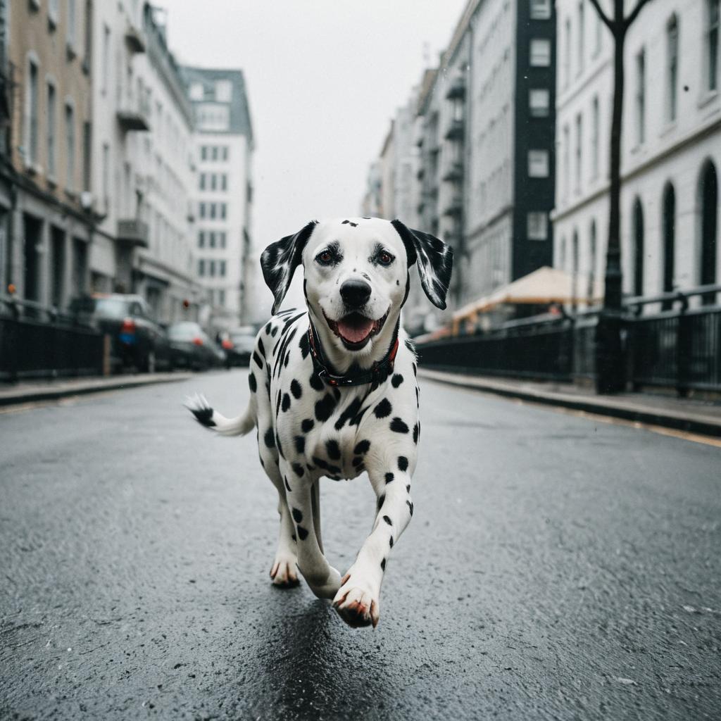 A captivating, high-resolution photograph of a Siberian husky, featuring smooth white fur with distinct black spots, running in an urban city under midday sun. The image is masterfully captured using a Canon EOS R6 mirrorless camera.