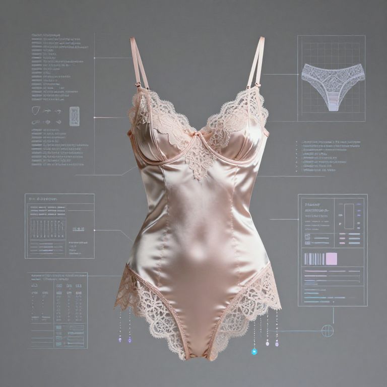 AI lingerie generator inspired digital art, conceptual imagery of artificial intelligence creating lace and satin lingerie patterns, surrounded by floating data streams and design grids, modern contemporary fashion meets advanced technology in ultra-detailed style