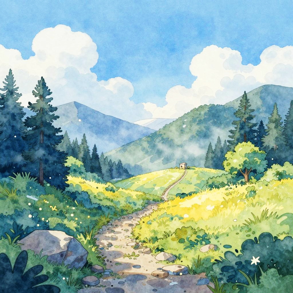 Watercolor illustration of a serene mountain valley with a bright blue sky and fluffy clouds. The artwork features a rocky path winding through lush greenery and a glowing golden field, leading to a small house on a distant hill. The scene includes blue-tinted mountain shapes, subtle fog, and playful light particles, evoking a peaceful and reflective atmosphere.