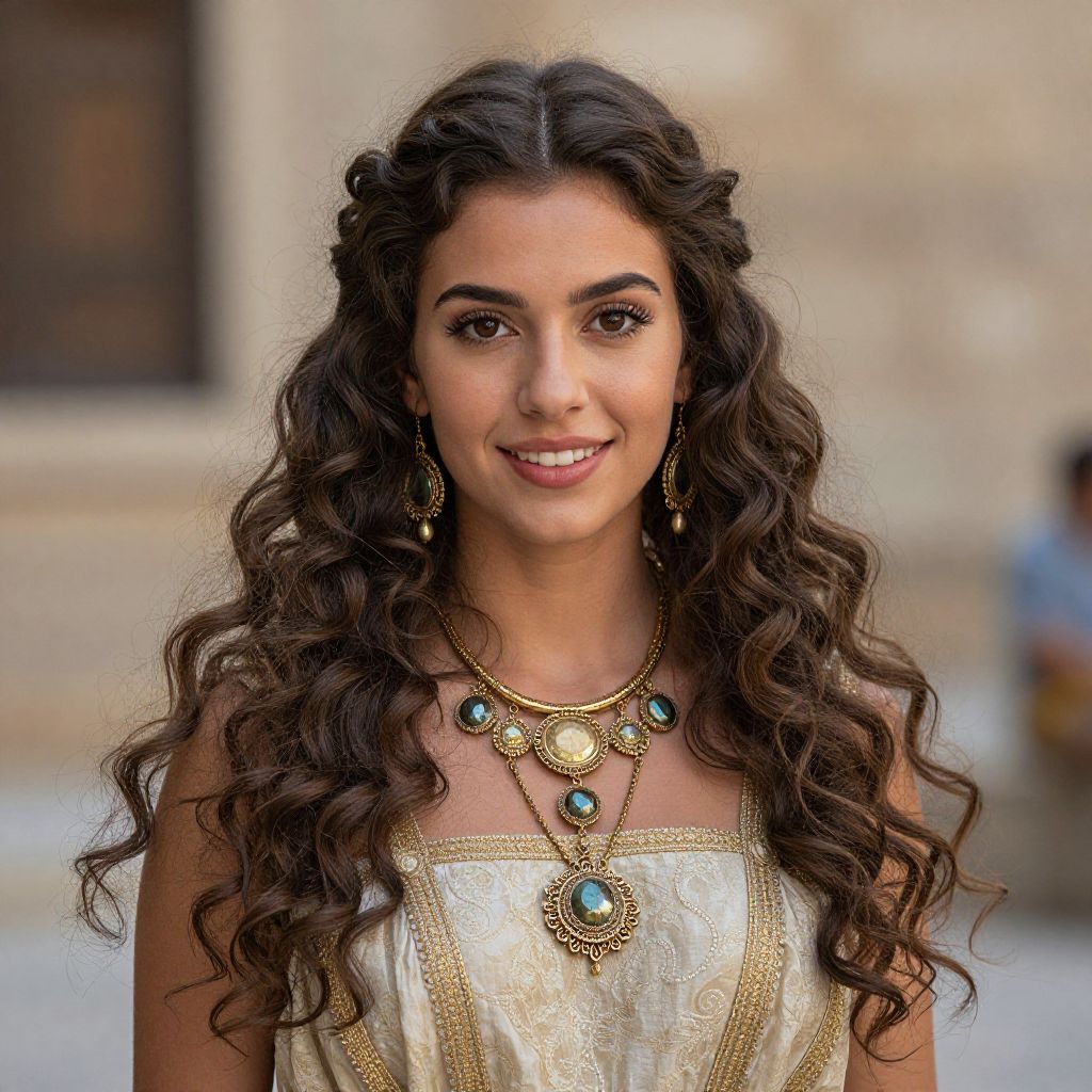 Hestia greek costume, 1girl, solo, jewelry, long hair, necklace, looking at viewer, brown hair, earrings, blurry background, smile, brown eyes, realistic, blurry, curly hair, outdoors, dress