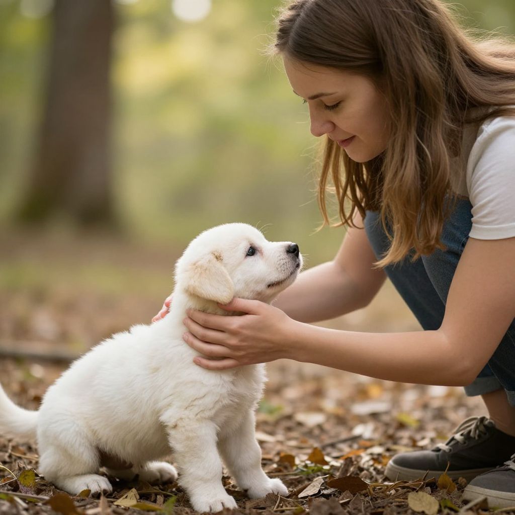 Woman Petting Puppy in Sunlit Forest