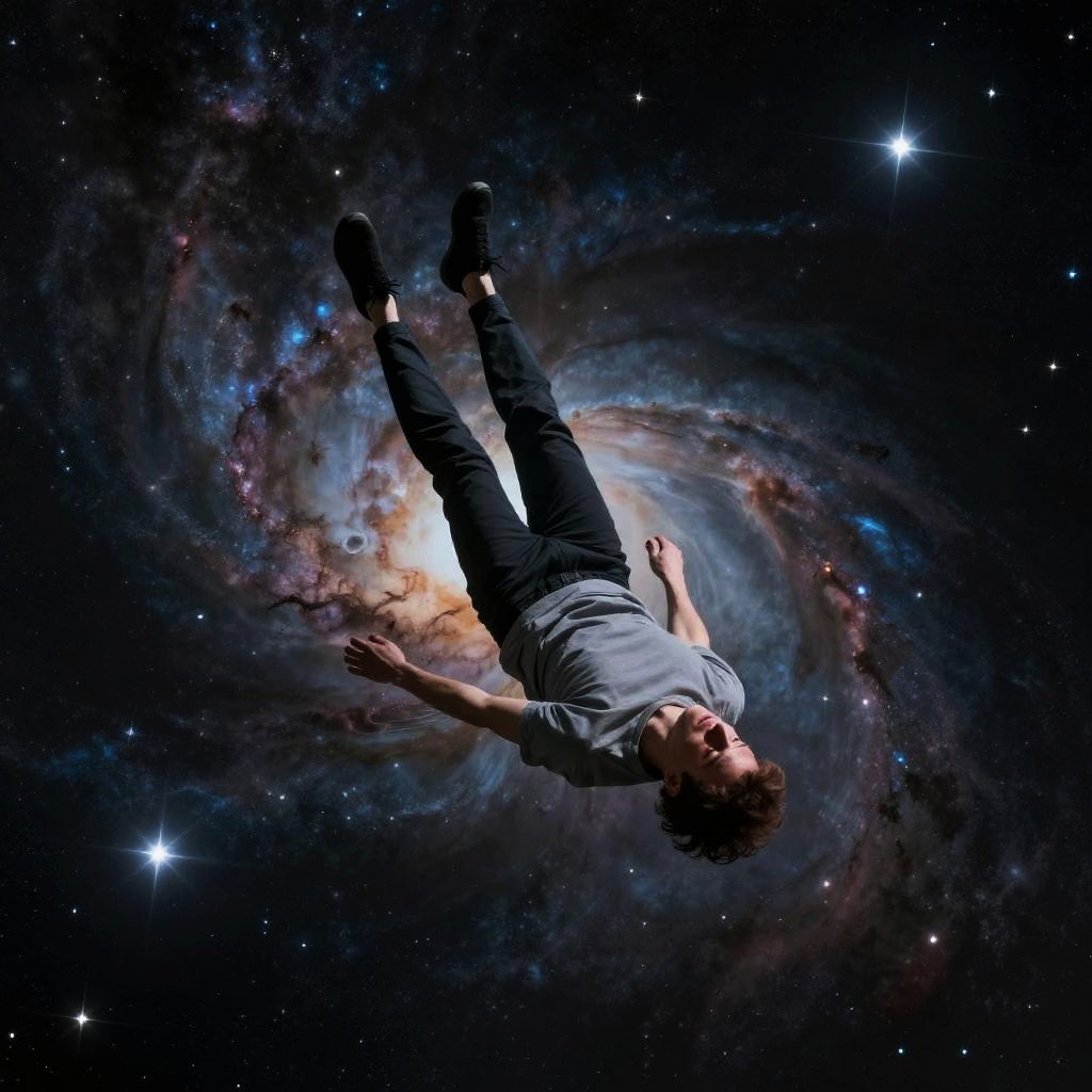 Photograph of a man in a grey shirt and black pants floating upside down amidst a vibrant, swirling galaxy with stars.