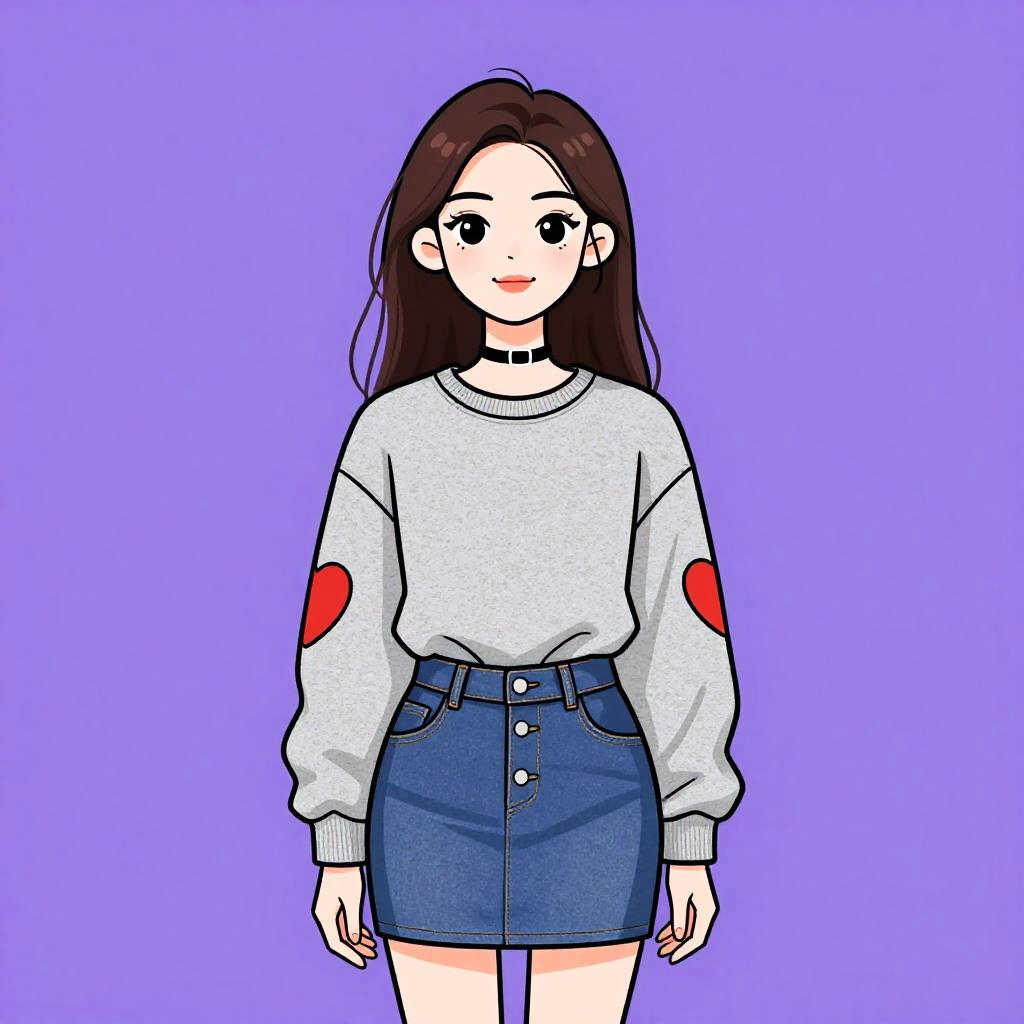 Woman with pretty face and pretty hair. Woman, casual, grey long sleeve crewneck sweatshirt, red heart elbow patches, slim fit, mini denim skirt with center-front button fastening, choker necklace. --sref 1467