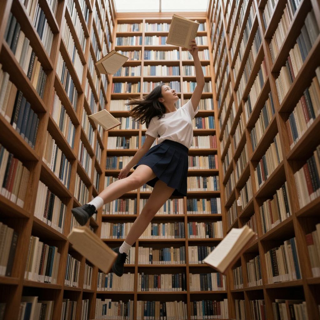 Photograph of a young Asian woman in a white shirt and black skirt, floating mid-air between towering bookshelves, holding and dropping books, with