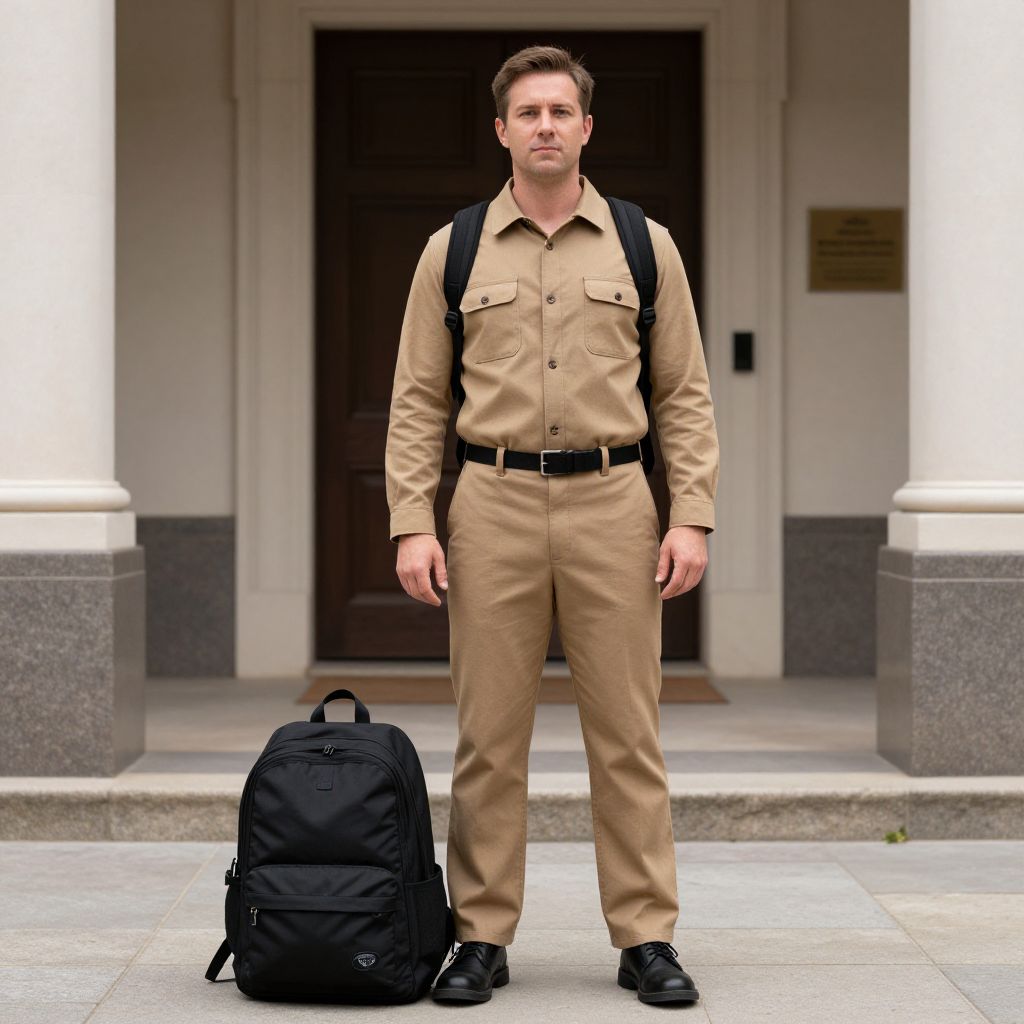 Photograph of a serious-looking Caucasian man with short brown hair, standing in front of a government building with white columns. He is wearing a beige long-sleeve button-up shirt, matching beige pants, black belt, and black shoes. He carries a black backpack and has a black duffel bag on the ground beside him. The background includes a dark wooden door and a gold plaque on the wall. The ground is paved, and the overall setting suggests an official or institutional location. The man's expression is neutral.