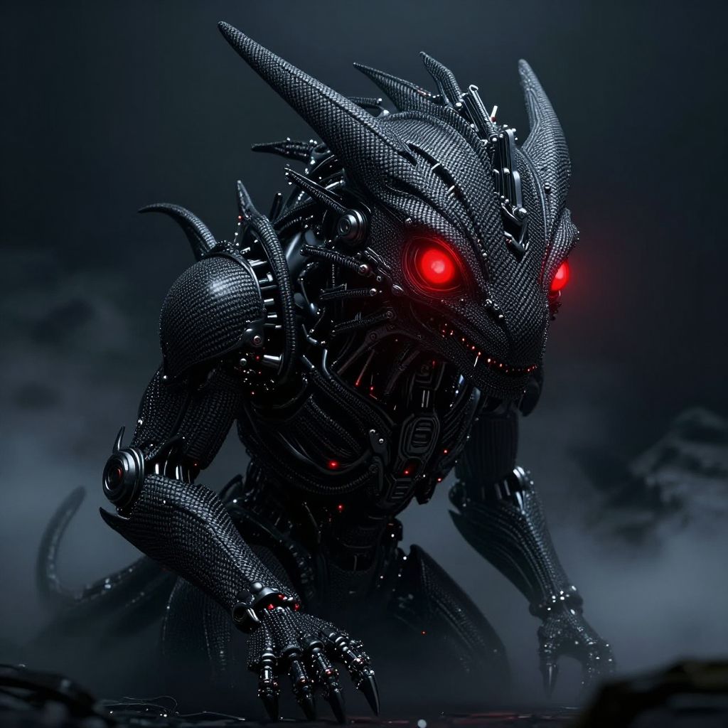 666 carbon digital art showcasing a mythical creature composed of carbon fiber strands, glowing red eyes piercing through the dark mist, intricate mechanical and organic hybrid textures, dark fantasy and high-tech fusion