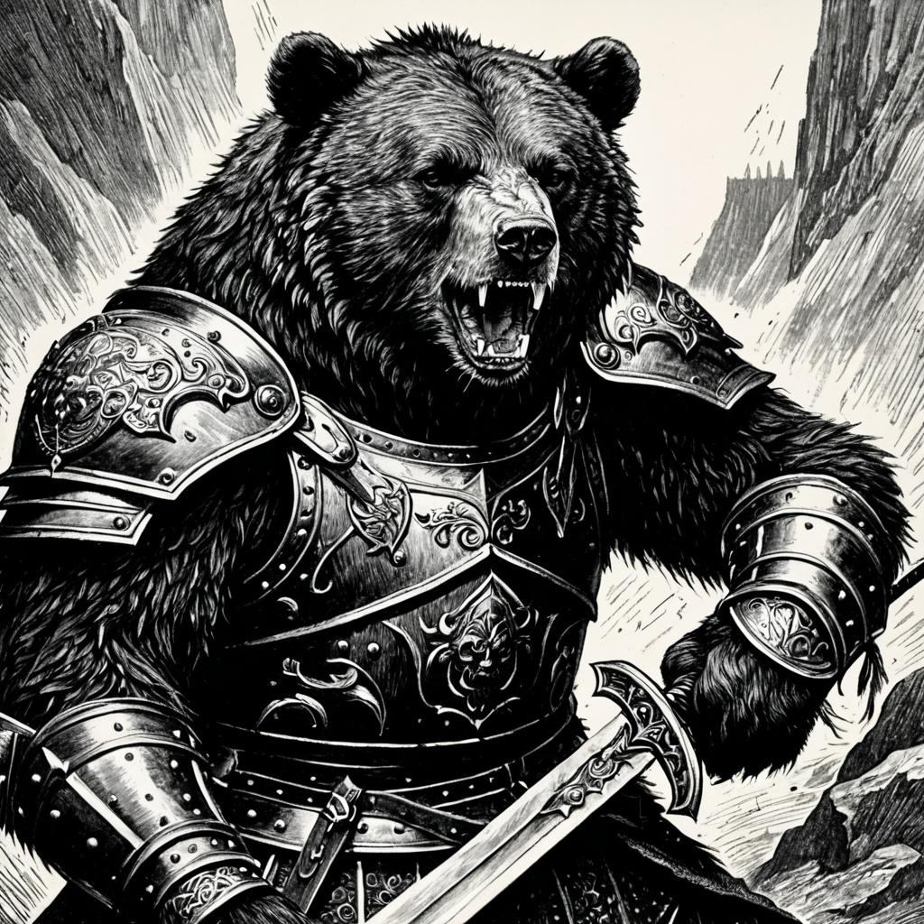 Detailed beautiful drawing of a snarling bear in Expressionism, wearing armor and holding a sword, by gustave dore, black ink