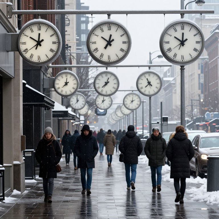 Mirrored clocks suspended above a bustling city street display varying times, creating an illusion of simultaneous pasts and futures as pedestrians navigate the snowy, reflective pavement below.