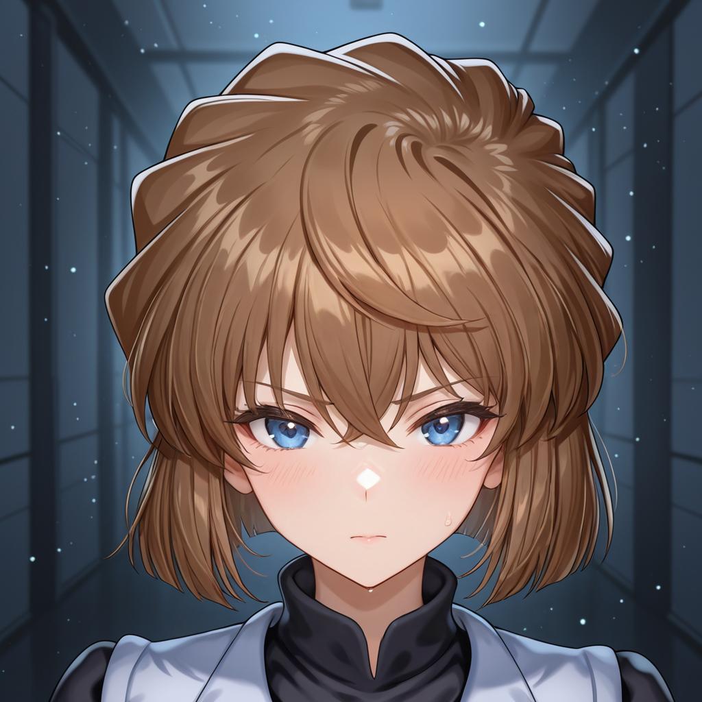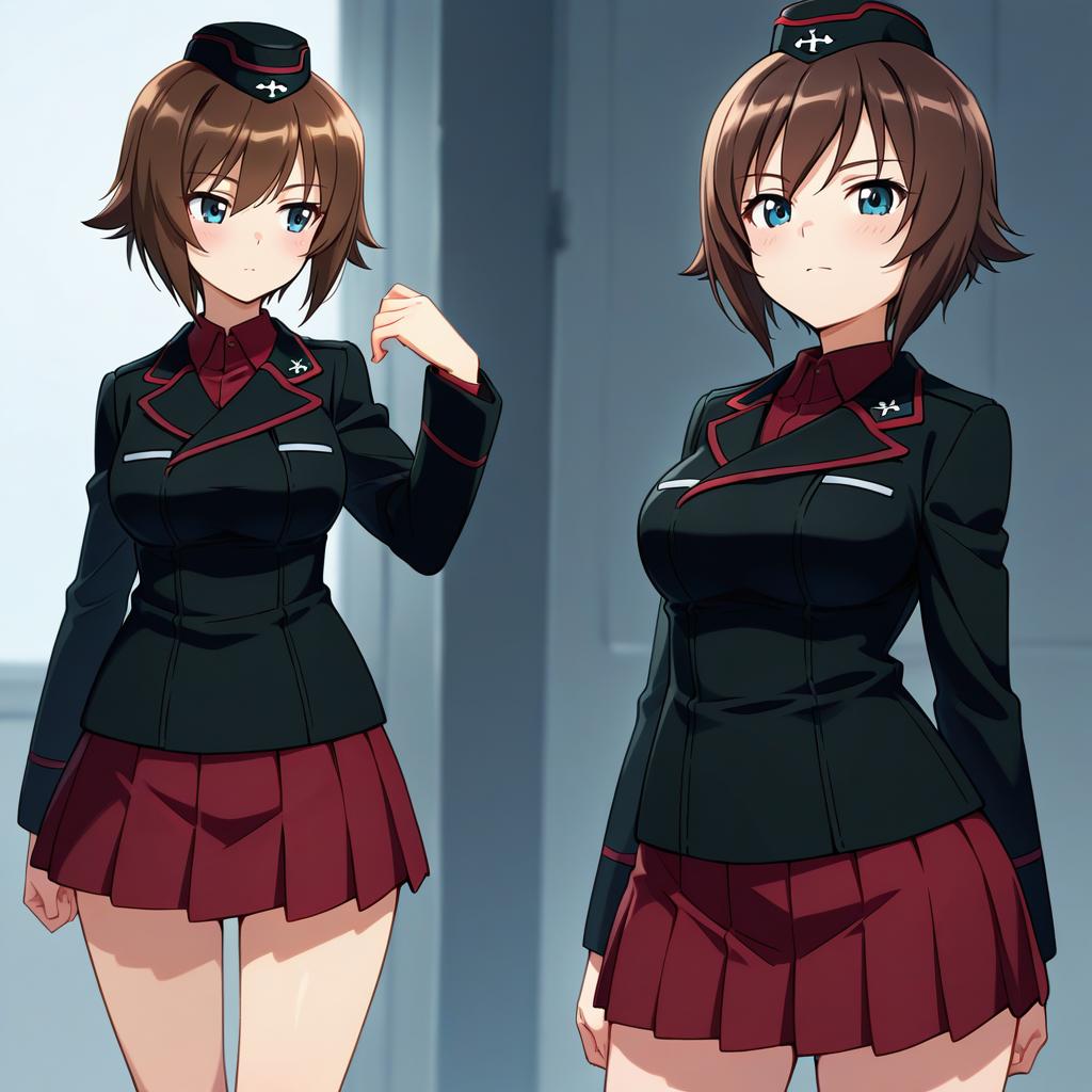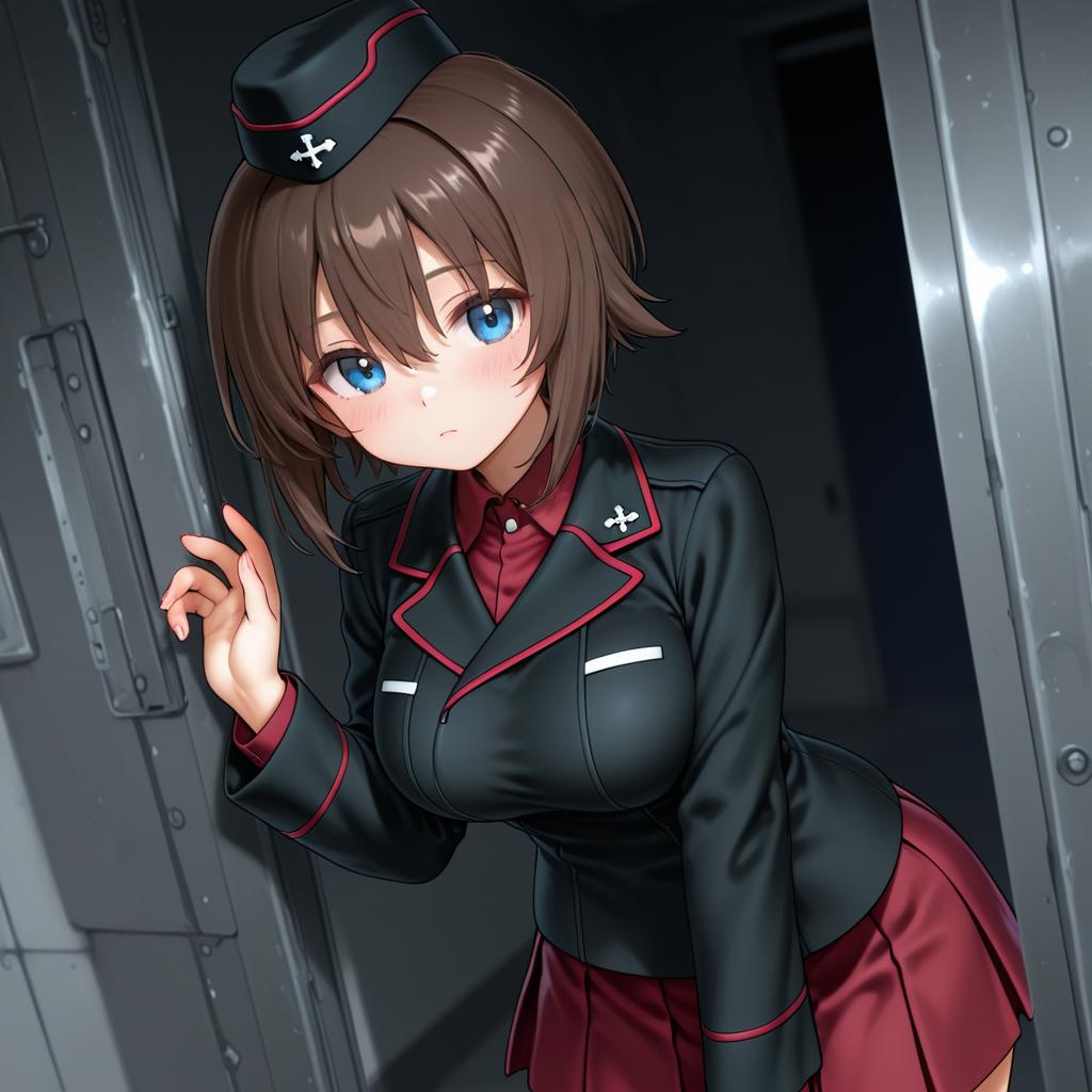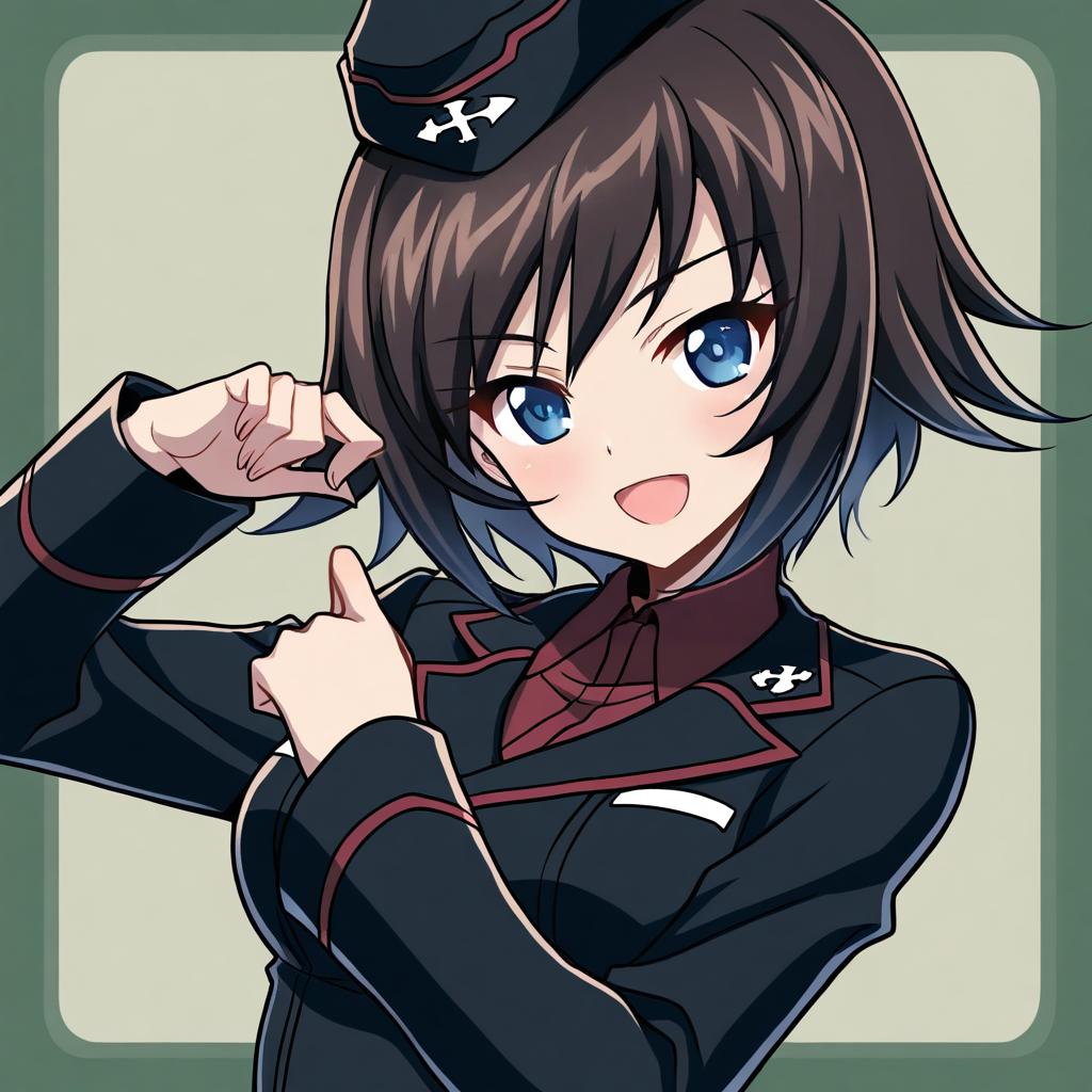 Hida ema, girls und panzer, 1girl, blue eyes, short hair, brown hair, medium breasts, kuromorimine military uniform, military uniform, kuromorimine military uniform, black jacket, dress shirt, garrison cap, red shirt, military uniform, pleated skirt, long sleeves, wing collar, insignia, by artist feint721, dark_illustrious