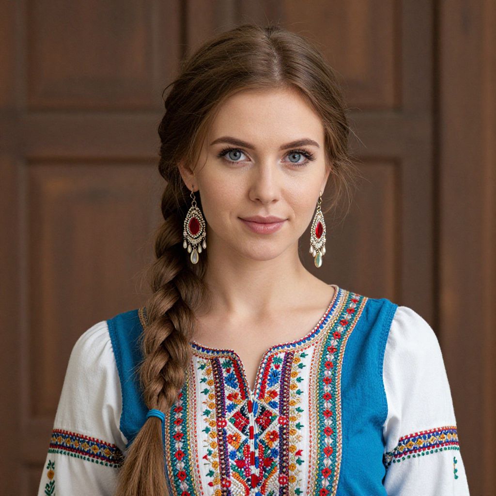 A young woman with long dark hair wearing a white dress adorned with colorful stripes in blue, yellow, purple, and green. She is standing indoors in a cozy room featuring a wooden table covered with a blue and white tasseled tablecloth and traditional woven rugs on a wooden floor. The setting has a warm and traditional atmosphere with framed artwork on the walls and a mix of patterned textiles.