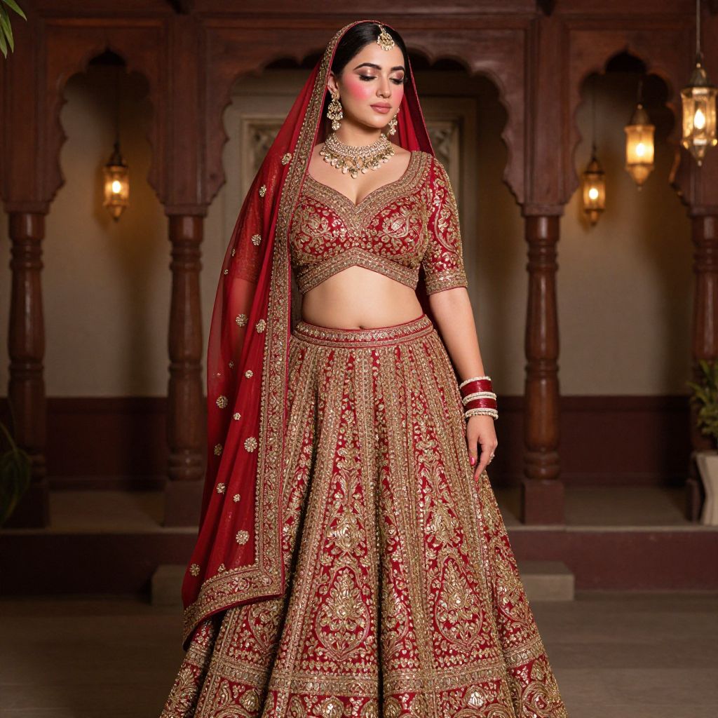 Photograph of a South Asian bride in a rich red and gold traditional lehenga with intricate embroidery, wearing a matching veil, jewelry, and makeup,