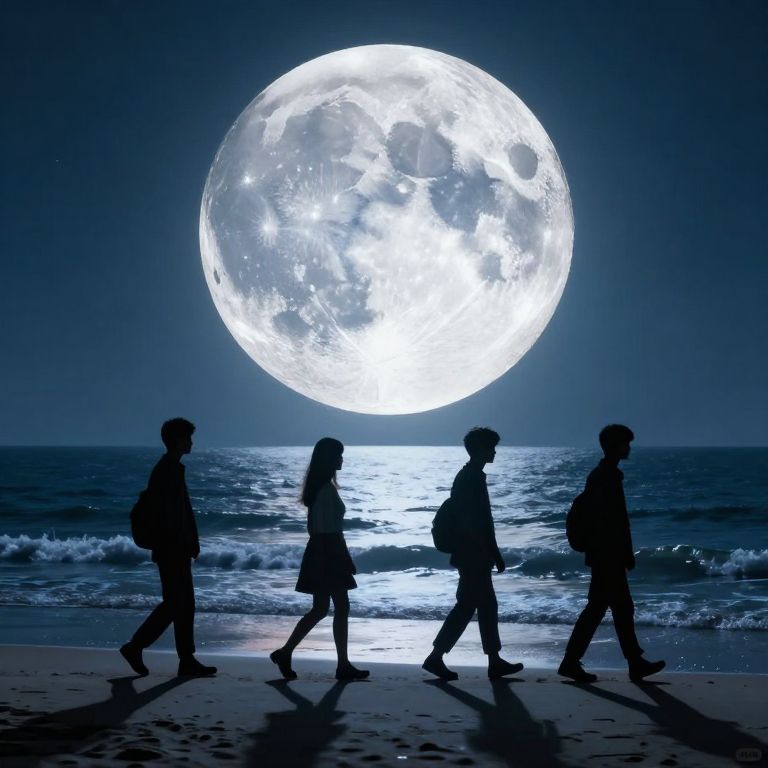 Silhouetted group of four people walking on a moonlit beach with a glowing, detailed full moon in the night sky.