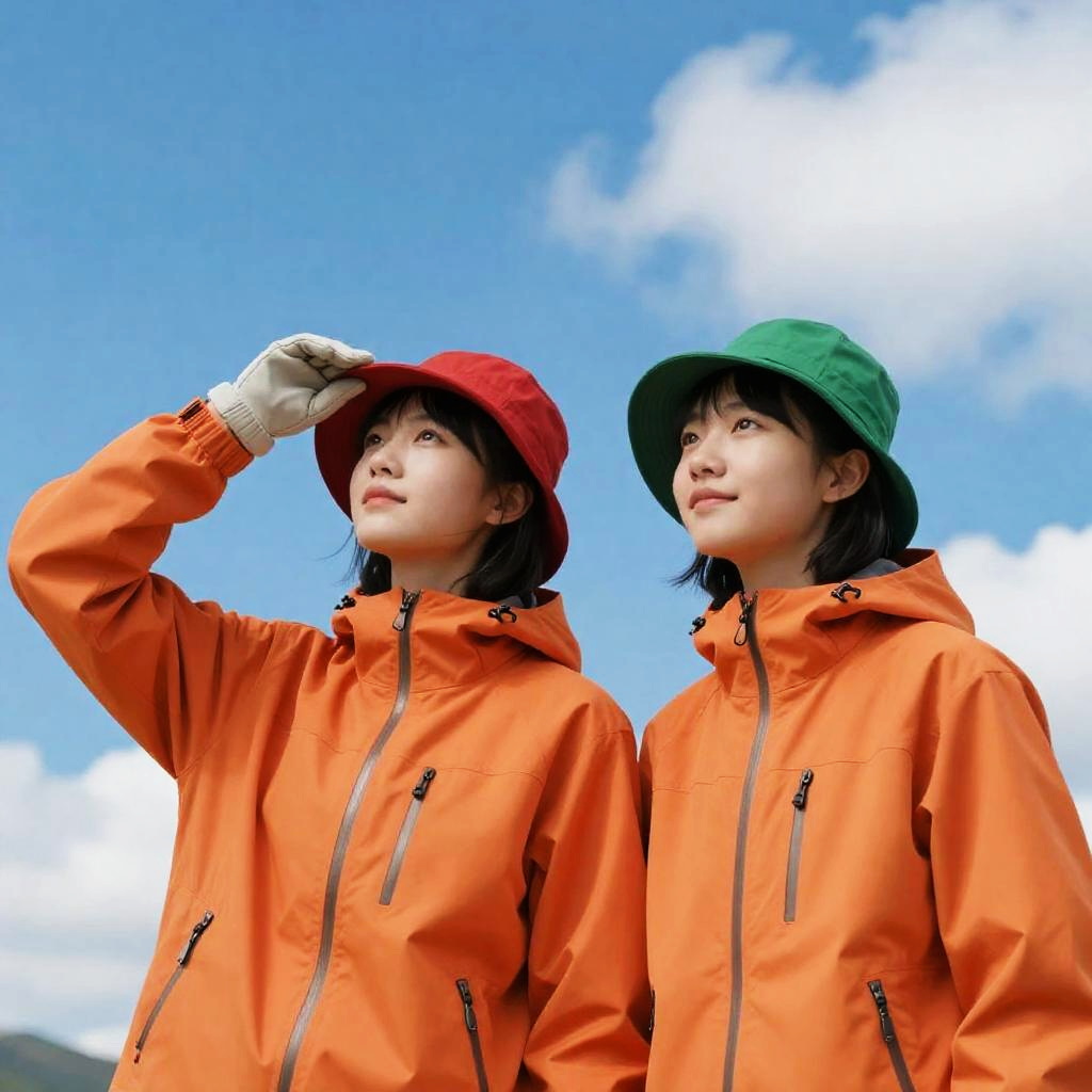 Photograph of two young people looking up, set against a bright blue sky with scattered clouds. Both wear orange jackets and hats; the person on the left has a red hat and light gloves, adjusting their hat with one hand. The person on the right wears a green bucket hat and has a slight smile. The background is a clear sky.