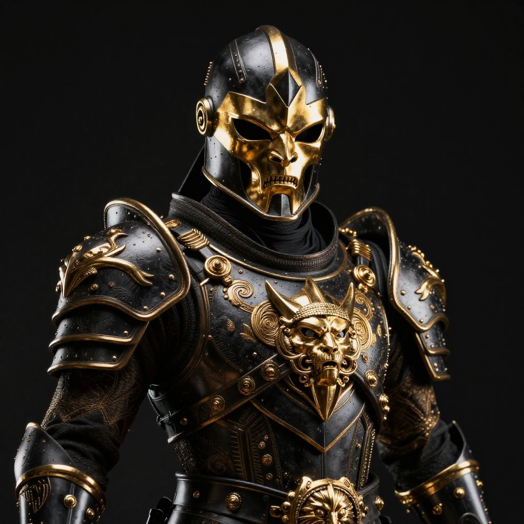 Gilded metal golem with helmet and mask, all-black armor, intimidating face mask and helmet, plain black background, dark black theme, Hasselblad H, dramatic, complex details, professional photography, 8k, photo-realistic, octane rendering, global illumination, RTX ray tracing, VFX post-processing