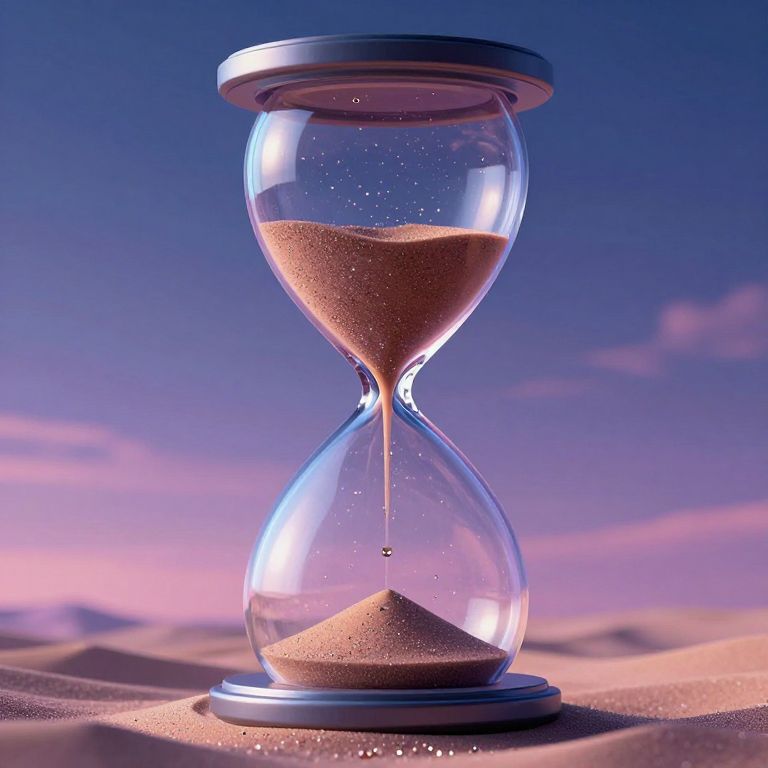 Photograph of a clear glass hourglass with a silver top and bottom, standing on a sandy surface. The hourglass contains fine, golden sand, with the upper chamber nearly full and the lower chamber partially filled. Tiny sand particles are suspended in the air, illuminated by soft, purple and pink hues from a twilight sky in the background. The sand's texture contrasts with the smooth, reflective glass, and the gentle waves in the sand add a natural, serene feel to the image.