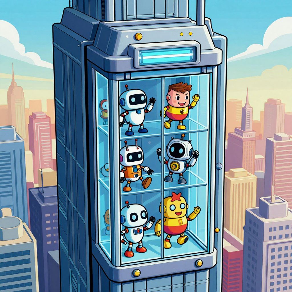 Elevator cartoon featuring a futuristic transparent elevator rising through a tall skyscraper, filled with imaginative robot and human characters in playful poses, rendered with sharp lines, bright contrasting colors, and a lively urban environment background.