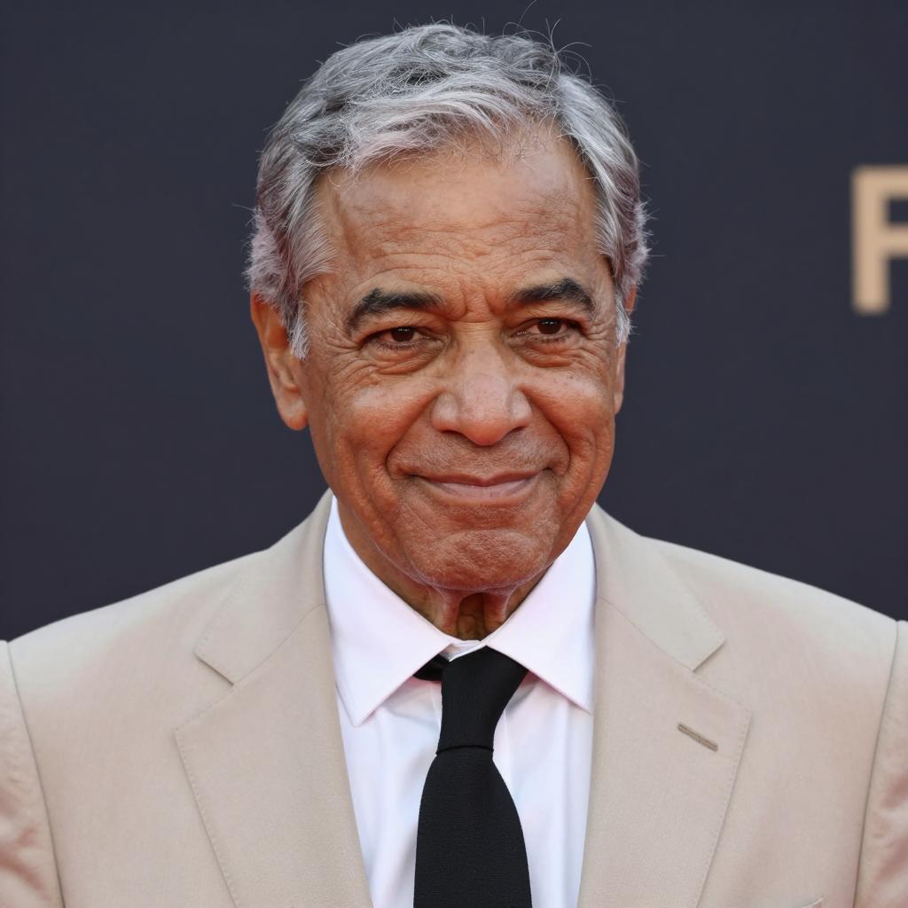 Middle-aged man with light brown skin, gray hair, and wrinkles, wearing a beige suit and white shirt with a black tie. He has a slight, knowing smile and is looking slightly downward. Background is dark and blurred.
