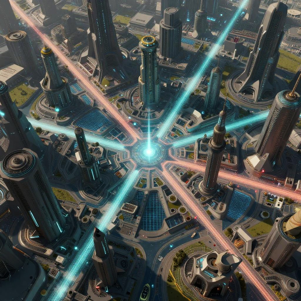 Sci-fi city map depicting an alien megacity with geometrically complex structures, luminescent streets, cyber grids, and dynamic lighting effects, blending organic and technological elements