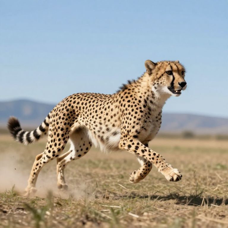 Photograph of a cheetah in mid-run across a dry, grassy savanna. The cheetah's sleek, tan coat is adorned with black spots, and its black-tipped tail is raised. Its muscular build and focused expression are visible as it strides forward, creating a slight dust cloud beneath its paws. The background features a clear, blue sky and distant, blurred hills. The cheetah's black "tear marks" run from its eyes down to its mouth, enhancing its predatory appearance. The image captures the speed and grace of the cheetah in its natural habitat.