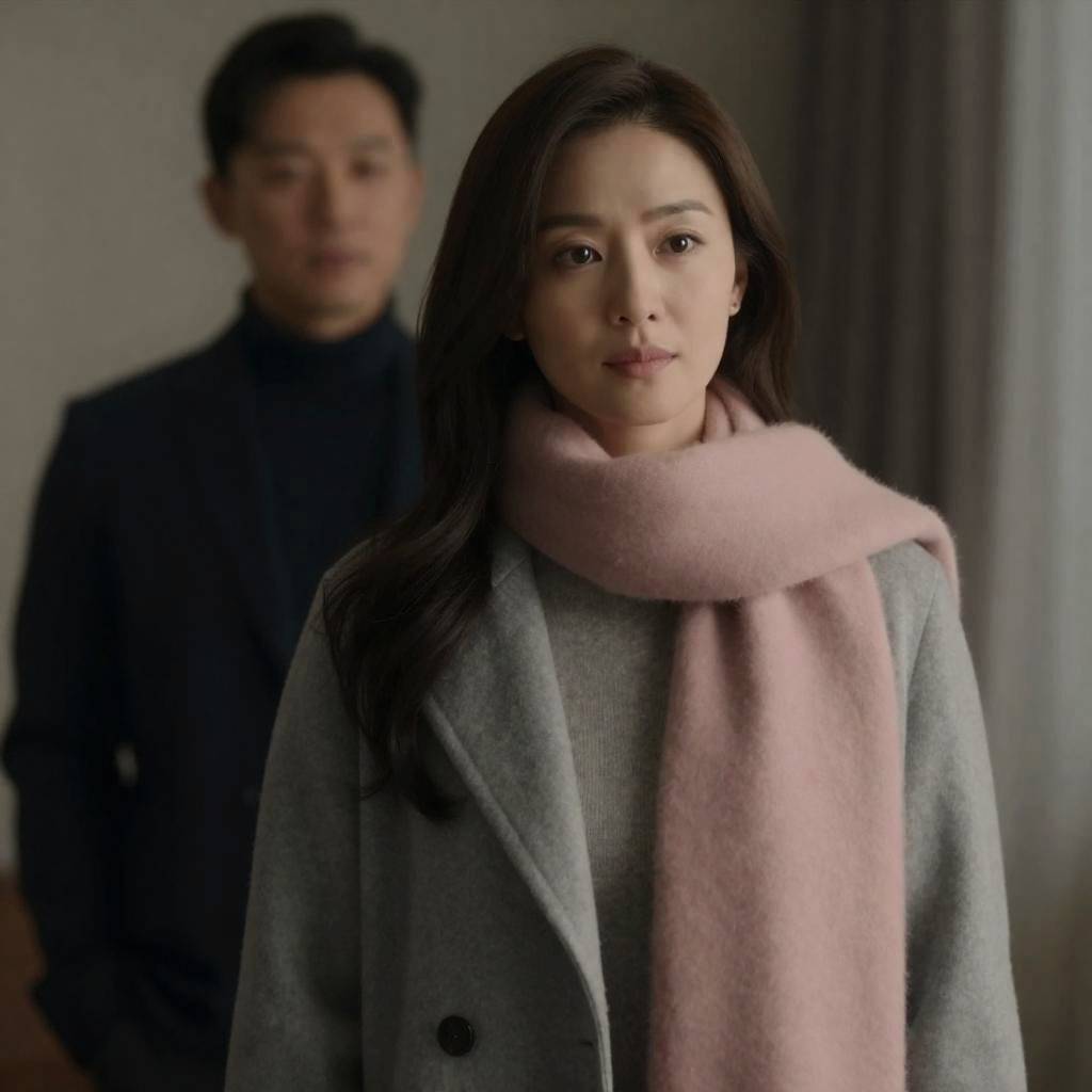 A photograph of an Asian woman with long brown hair and light skin, dressed in a gray coat and a soft pink scarf, standing in a dimly lit room. A man wearing dark clothing stands blurred in the background, looking towards her. Neutral-colored curtains are visible on the right side of the image.