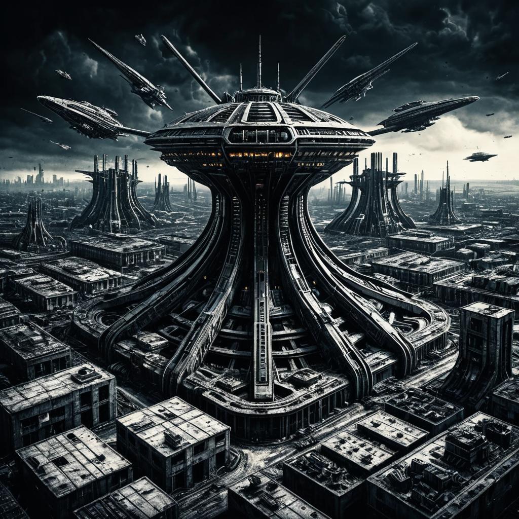 A detailed digital illustration inspired by Moebius, depicting an underground labyrinth filled with intricate biomechanical structures. The design features concentric circular levels with complex mechanical components, creating a futuristic and otherworldly atmosphere as if subjected to bombardment from massive starships.