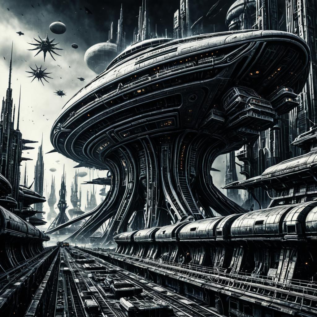 Illustration in the style of Moebius, an underground labyrinth filled with biomechanical structures subjected to bombardment from huge starships