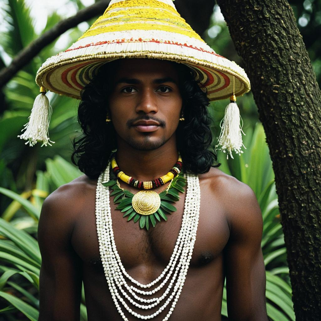 Portrait of a young dark-skinned man wearing traditional Onam celebration attire, including a large yellow and white woven hat with tassels, ornate beaded and leaf necklace with a central golden medallion, and layered white bead necklaces. The man has long black curly hair and is standing shirtless against a natural backdrop of trees and green plants.